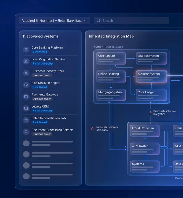 Expose inherited integrations, hidden logic, and data flows to bring acquired environments back under control.